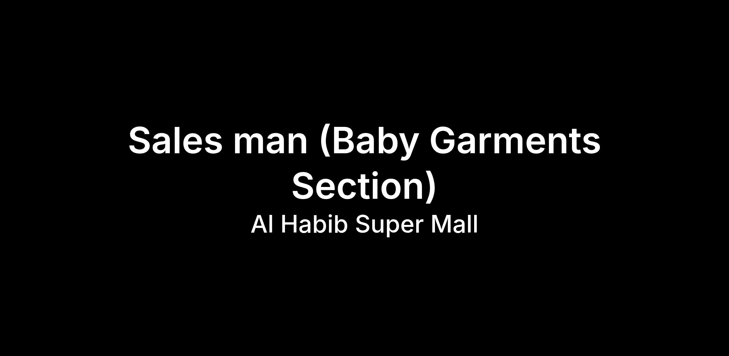 Al Habib Super Mall (Established 1991) is looking for an active and experienced Salesman to manage and drive sales in our Baby Garments Section. The ideal candidate will have a strong understanding of children's apparel and retail sales, helping parents and families find the right products. If you have a friendly personality and excellent communication skills, we want you on our team.